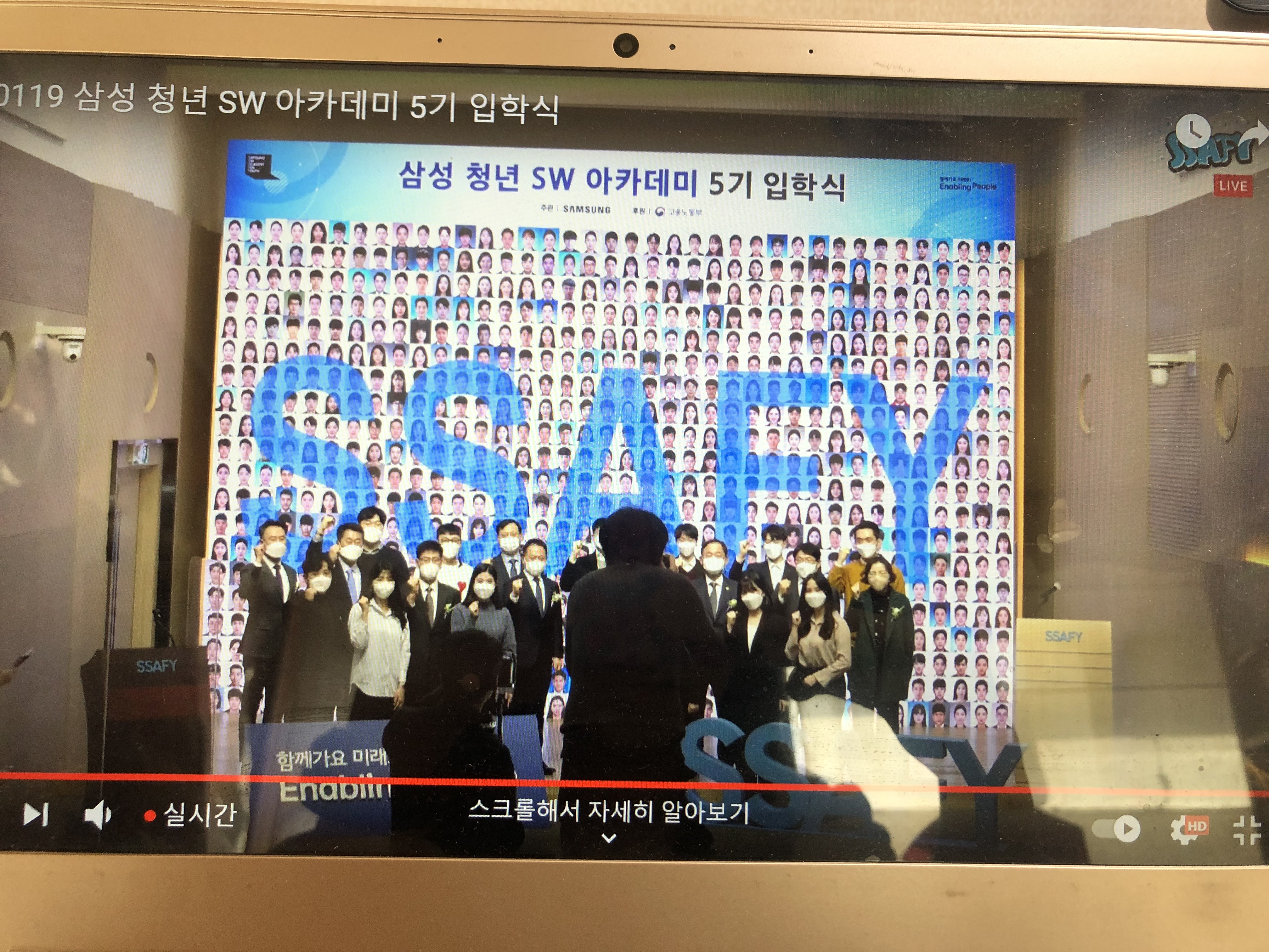 1/19에 입학식을 했다. 유튜브 라이브로 진행되었던지라 집에서 쉽게 참여할 수 있어서 좋기도 했지만 입학식에 직접 참석하지 못해서 아쉽다. 진행하시는 아나운서분도 오시고 삼성전자 사장님도 오시고 너무 신기했다! 5기 단체사진 찍을 때 사진 찍었다! 저 뒤에 배경에 있는 사진은 5기 전체의 사진을 붙인거라고 그랬다. 나는 어디에 있을까! 이번 싸피 5기의 슬로건인 오기로 극복!하여 1학기 잘 수료했으면 좋겠다.